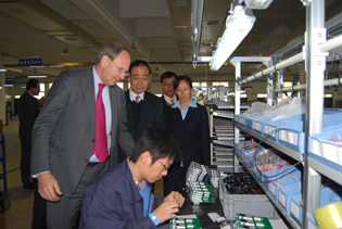 日前,瑞士迅達(dá)集團(tuán)副董事長Mr.Luc Bonnard(上圖左),總裁Mr.Tinggren(上圖右)先后蒞臨公司,在公司董事長劉金忠、總經(jīng)理劉剛、常務(wù)副總經(jīng)理李國鈞、副總經(jīng)理陳衛(wèi)東的陪同下,對公司各個廠區(qū)的生產(chǎn)情況、銷售狀況、項(xiàng)目安裝運(yùn)行情況等等,進(jìn)行了詳細(xì)查看和了解,并對公司整體生產(chǎn)經(jīng)營情況給予了較高評價。圖為公司領(lǐng)導(dǎo)陪同Mr.Luc Bonnard和Mr.Tinggren在車間視察。