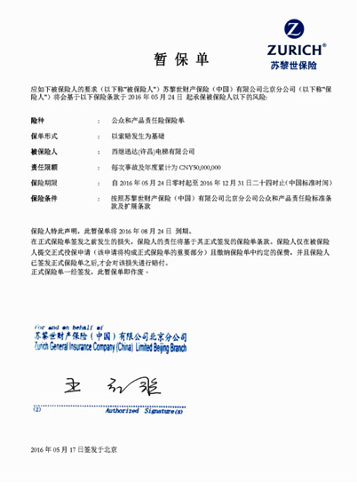 5月24日起,西繼迅達全系列電梯產品被納入迅達全球一般及產品責任保險計劃,由蘇黎世保險(中國)有限公司統一承保公司公眾和產品責任保險。圖為蘇黎世保險為公司出具的保險單。