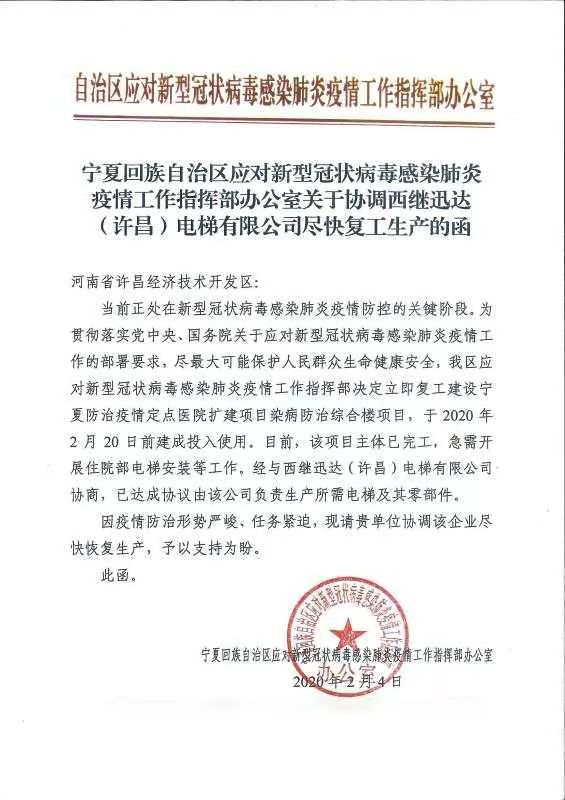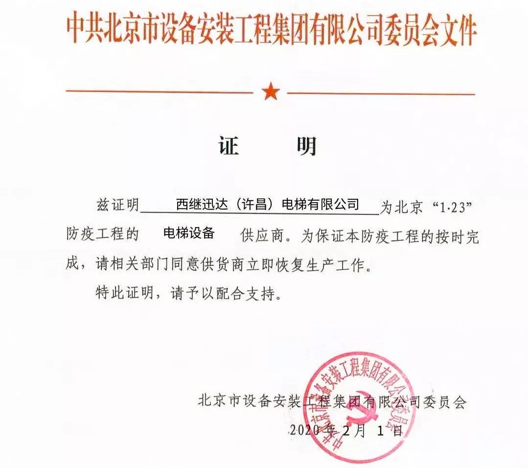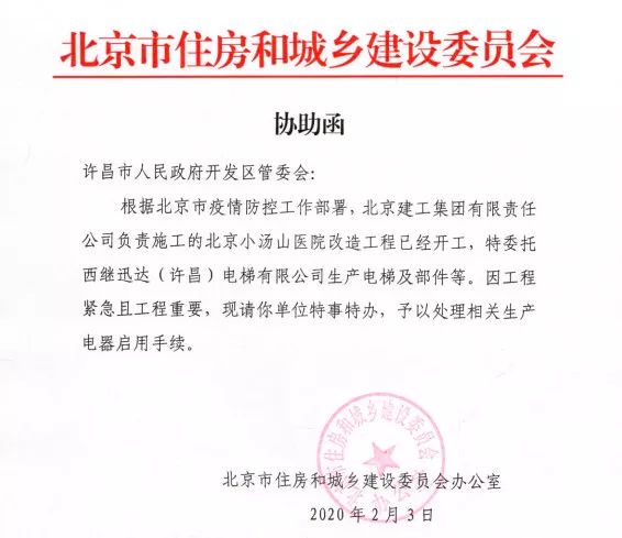 北京市住房和城鄉建設委員會給許昌市開發區管委會發來協助函,根據北京疫情防控工作部署,北京小湯山醫院改造工程已經開工,委托西繼迅達生產電梯及部件。因工程緊急,特事特辦,予以提前復工。