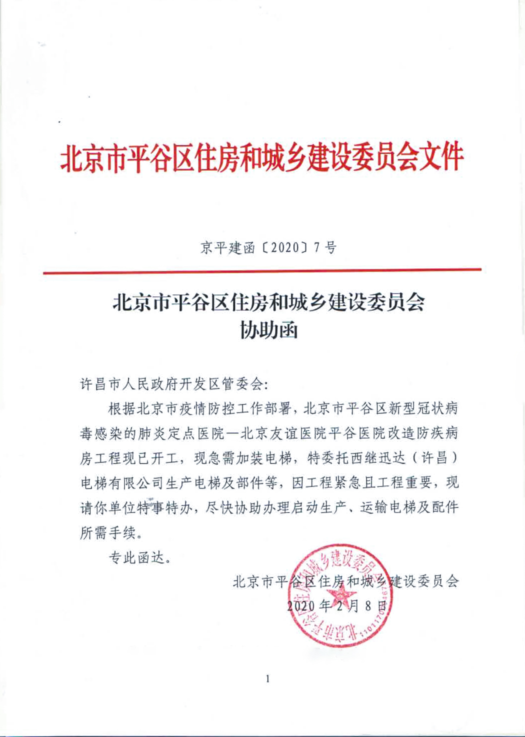 2月8日:北京市平谷區住房和城鄉建設委員會發來函件,為應對疫情而建設的北京市新冠肺炎定點醫院改造防疾病房工程,急需開展加裝電梯工作,特委托西繼迅達盡快安排生產電梯及部件等。