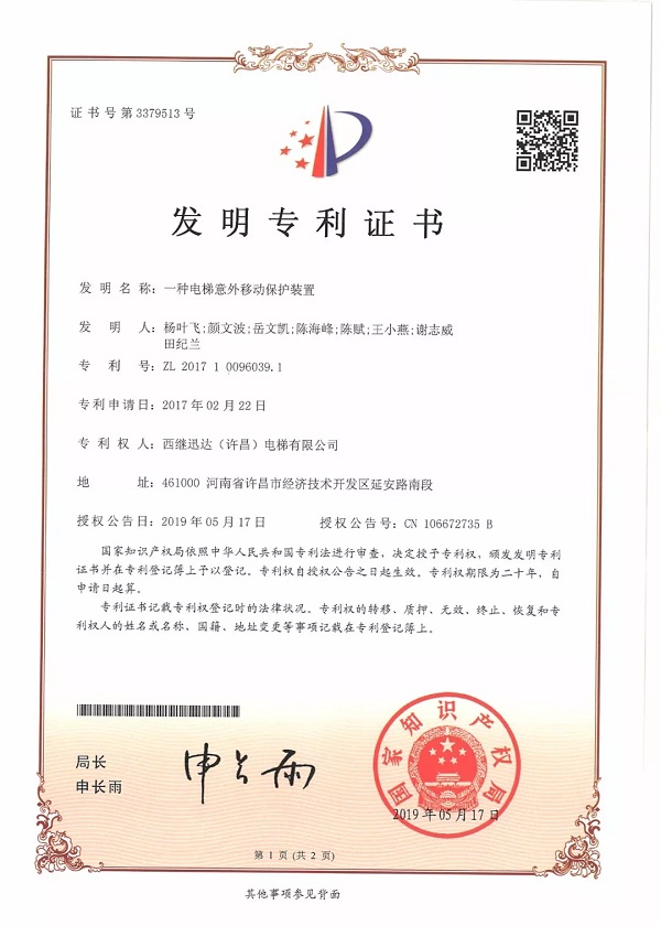 日前,“一種電梯轎廂意外移動檢測及保護系統”被正式授予發明專利證書。專利權人為西繼迅達電梯,專利號為ZL201710096186.9,該專利于2017年2月22日申請,授權公告日為2019年5月17日,授予公告號為CN106829676B。